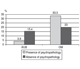 Background. Given the increasing prevalence of mental health problems in the Ukrainian population of girls affected by war, there is significant interest in understanding potential biological mechanisms, including the contribution of sex hormones. The purpose was to clarify the patterns of relationships of adrenal and sex hormones in adolescent girls with menstrual disorders in a front-line city, taking into account mental status. Materials and methods. In 2022–2024, 179 adolescent girls aged 11–17 years with menstrual disorders were examined: 85 with abnormal uterine bleeding (AUB) and 94 with oligomenorrhea (OM). The examination algorithm included determination of blood levels of testosterone (T), estradiol (E2), cortisol (C), dehydroepiandrosterone sulfate (DHEA-S). The coefficients T/E2, T/C, C/DHEA-S were calculated using untransformed, raw values of basal hormone levels. The diagnosis of psychopathology was made based on the clinical picture at the time of examination meeting the ICD-10 criteria. Results. When comparing the average levels of steroid hormones between patients with AUB and OM, it was found that the content of sex hormones (testosterone, E2, T/E2) in girls with OM without manifestations of psychopathology was significantly higher than in AUB (P < 0.04–0.002). In the presence of psychopathology, the reliability was maintained only in relation to E2 (P < 0.04). Adrenal hormones (cortisol, DHEA-S, C/DHEA-S) did not have a significant difference between patients with AUB and OM without manifestations of psychopathology. In mental disorders, the level of DHEA-S was significantly higher in adolescents with OM (P < 0.02), and the ratio of C/DHEA-S was lower (P < 0.03) than in girls with AUB. The formation of psychopathology against the background of war in adolescent girls with different types of menstrual disorders occurs under the influence of specific changes in steroid hormones. AUB is characterized by an increase in sex hormones (testosterone, E2), a decrease in cortisol and an increase in the ratio of C/DHEA-S. Psychopathology in OM, on the contrary, is formed against the background of reduced levels of sex hormones, an increase in the protective adrenal hormone DHEA-S and a decrease in the ratio of C/DHEA-S. All this may indicate that in girls with OM and psychopathology, the adrenal system parameters demonstrate a more adequate response of the body to stress. Adolescents with AUB are more maladapted, which may contribute to the transition of AUB to a recurrent form. Conclusions. The implementation of the steroid hormone response to war stress in girls with opposite conditions (AUB and OM) occurs differently depending on the type of disorder. In AUB and OM, opposite changes in sex hormones are noted, especially against the background of psychopathological states. The concentration of adrenal hormones also differs significantly in adolescents with AUB and OM. The general pattern of steroid hormones indicates a more adequate response to stress in girls with OM.