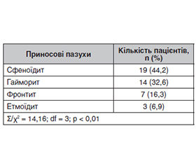 Актуальність. Орбітальні ускладнення синуситів — це група захворювань очної ямки, які розвиваються на тлі запальних уражень придаткових пазух носа. За даними багатьох авторів, перше місце посідає запалення верхньощелепних пазух, на другому місці — запалення решітчастих лабіринтів, на третьому — сфеноїдальних пазух. Мета: проаналізувати частоту виникнення і подати клінічну характеристику невриту зорового нерва, що виник унаслідок запалення приносових порожнин. Матеріали та методи. Обстежені 43 пацієнти (43 ока) — 14 жінок (32,6 %) і 29 чоловіків (67,4 %) віком від 19 до 58 років з діагнозом невриту зорового нерва. Після огляду та збору анамнезу ми запідозрили, що неврит виник унаслідок запалення приносових порожнин. У всіх пацієнтів спостерігався монолатеральний процес. Проводилися загальноклінічне обстеження, визначення гостроти зору, поля зору, офтальмоскопія, комп’ютерна томографія, передня і задня риноскопія, фарингоскопія, рентгеноскопія в прямих проєкціях і прицільній боковій проєкції, ендоскопія. Результати. Основні клінічні скарги пацієнтів на погіршення або втрату зору, головний біль, частіше в зоні скроні й потилиці та при нахилі голови вперед, ускладнення дихання і виділення з носа, слабкість, температуру дають нам підстави запідозрити запальний процес у приносових пазухах. Найбільш поширеною причиною виникнення невриту зорового нерва внаслідок запалення приносових пазух визнано сфеноїдити. Це пов’язано з тим, що найбільш часто зоровий нерв розташовується близько до задньої ґратчастої та клиноподібної пазух без контакту або поглиблення стінки. На другому місці — гайморити, на третьому — фронтити. Висновки. Сфеноїдит найбільш часто діагностується як причина серйозних ускладнень, як-от неврит зорового нерва і менінгіт. Запалення приносових пазух можуть давати дуже серйозні ускладнення: неврит зорового нерва, менінгіт, тромбоз печеристого синуса. У всіх випадках, коли це захворювання лише запідозрено, необхідно терміново вживати заходів щодо диференціальної діагностики й лікування. Найчастіше в запальний процес зорового нерва (неврит) залучена сфеноїдальна пазуха, що потребує негайного лікування для запобігання ускладненням.