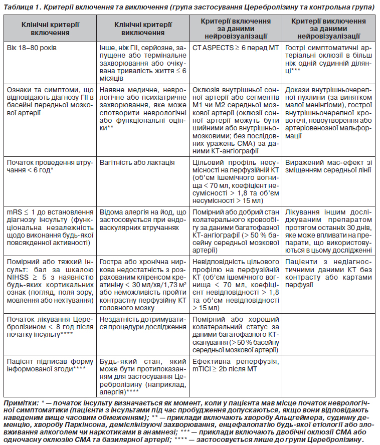 Ефективність лікування Церебролізином як додаткової терапії до механічної тромбектомії у пацієнтів з гострим ішемічним інсультом, спричиненим оклюзією великих судин в басейні передньої мозкової артерії: результати 3-місячного періоду спостереження у проспективному відкритому одноцентровому дослідженні