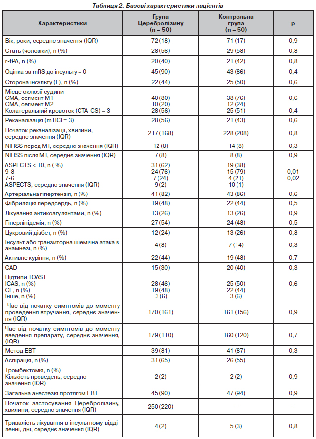 Пацієнти з групи Церебролізину та контрольної групи були добре порівнянні за більшістю вихідних змінних (табл. 2). Не було статистично вірогідних відмінностей у демографічних показниках, супутніх захворюваннях, етіології та тяжкості інсульту, а також у результатах, пов’язаних з процедурою. Водночас пацієнти з групи Церебролізину мали нижчий бал за шкалою ASPECTS порівняно з контрольною групою (медіана 9 проти 10 балів). Обидві групи не відрізнялися за вихідним об’ємом невідповідності (група Церебролізину проти контрольної: 90 мл [IQR 129] та 100 мл [68], p = 0,5) і за об’ємом ішемічного вогнища (визначеного як rCBF < 30 %: 10 мл [27] та 7 мл [15], p = 0,2 відповідно). В обох групах була схожа кількість пацієнтів з однаковою етіологією інсульту, майже у половини пацієнтів спостерігався кардіоемболічний інсульт, усі випадки зумовлені фібриляцією передсердь (AF).