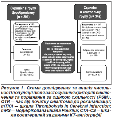 У період з червня 2021 року по грудень 2023 року ми обстежили 291 пацієнта, госпіталізованого до нашого Комплексного центру лікування інсульту з помірним або тяжким ГІІ, спричиненим оклюзією передньої мозкової артерії, яким призначали МТ протягом 6 годин від початку інсульту. Зрештою, у дослідження було включено 50 пацієнтів (17 %), які досягли значної реперфузії після МТ (mTICI 2b–3), мали хороший колатеральний кровотік (КТА 2–3) та значний неврологічний дефіцит після МТ (NIHSS > 5) з кортикальними ознаками, які відповідали іншим клінічним та нейровізуалізаційним критеріям (табл. 1) та могли отримати Церебролізин протягом 8 годин від початку інсульту. Недостатній колатеральний кровотік і тяжка афазія або нехтування, що унеможливлювало надання інформованої згоди, були найчастішими причинами невдалого скринінгу та низького рівня набору (рис. 1).