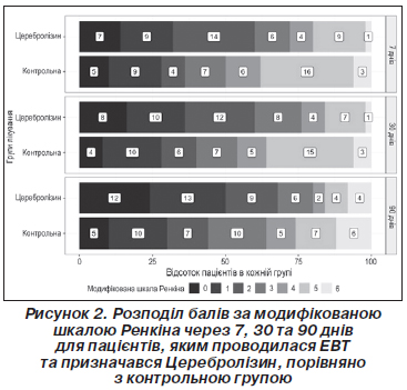 Показником первинного результату була частка пацієнтів, які отримували Церебролізин, у яких спостерігався сприятливий функціональний результат (mRS 0–2) через 90 днів після початку інсульту порівняно з контрольною групою.