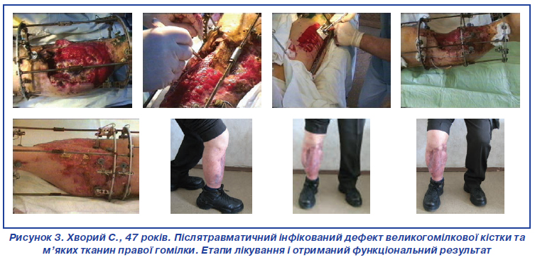 Дистракційний метод КФ дозволяв здійснити заміщення інфікованого дефекту великогомілкової кістки, м’яких тканин шляхом механічного зменшення розміру дефекту і поліпшення судинного кровопостачання. Комплексна терапія (мультимодальне періопераційне знеболювання із застосуванням Дексалгіну®, інфулгану, перидуральної анестезії маркаїном, антибактеріальна терапія, етапний дебридмент, ВАК-терапія, напівжорсткі пов’язки) дозволила досягти непоганих результатів. Наводимо приклад клінічного випадку (рис. 3).